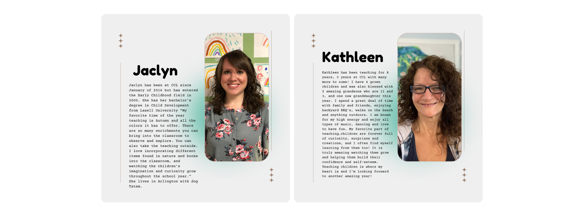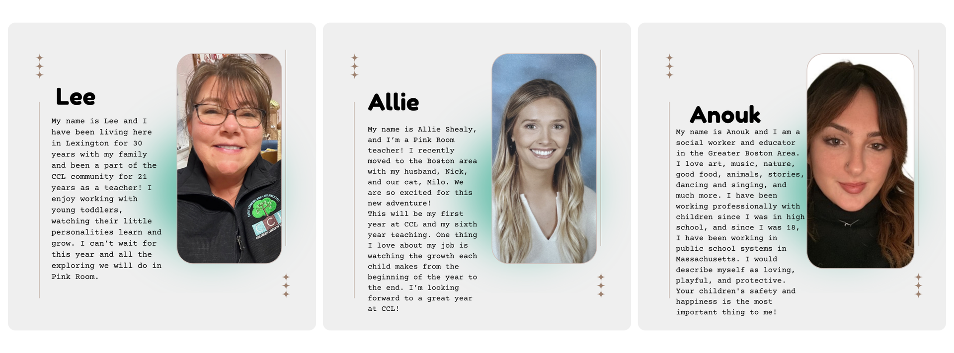 Our teachers and staff are the foundation of our center. We pride ourselves on the retention of our staff, several of whom have worked at CCL for decades. Our teachers are highly educated with Associates, Bachelors and Masters Degrees. All classroom teachers are certified by the Massachusetts Department of Early Education and Care and are certified in first aid and CPR.
