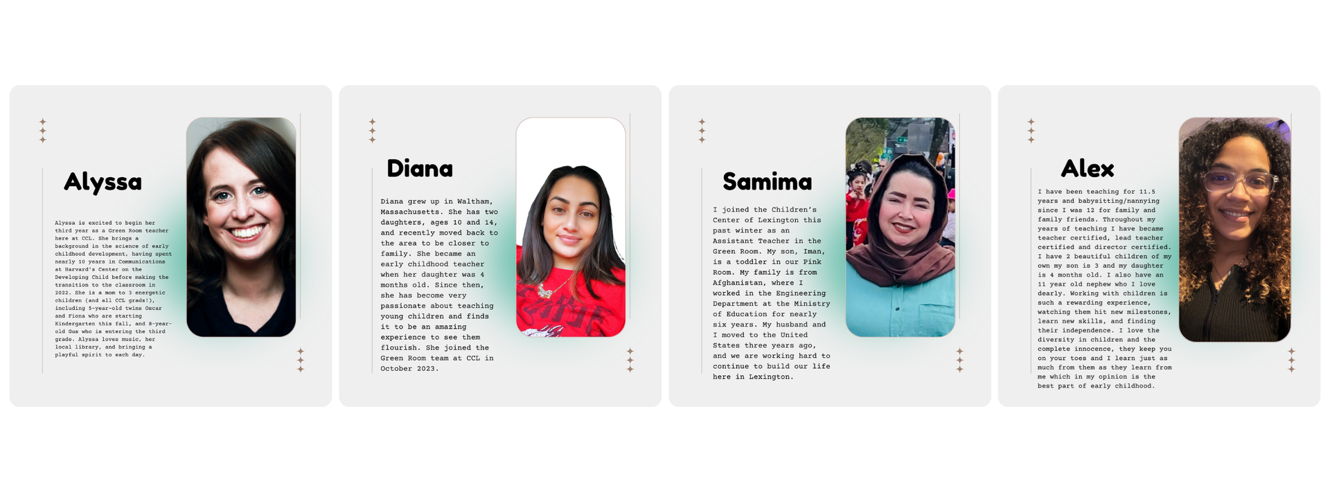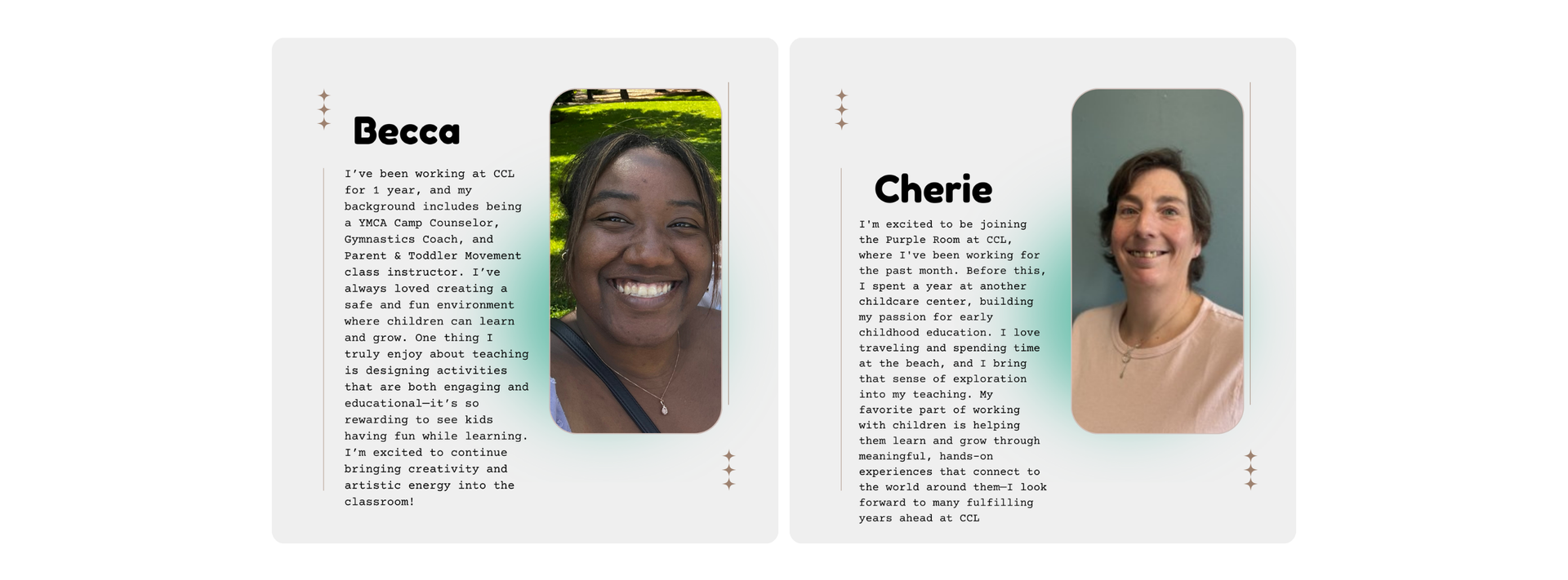 "I’ve been in the childcare field for over 20 years. I’ve been a part of the Children’s Center of Lexington for the past 8 years, and I’m thrilled to now serve as Director. I married my high school sweetheart, and we have a 10-year-old son who is a proud CCL alum. What I love most about CCL is the strong sense of community—we aren’t just a school, we are truly a family. I’m so excited for all that this year will bring!"